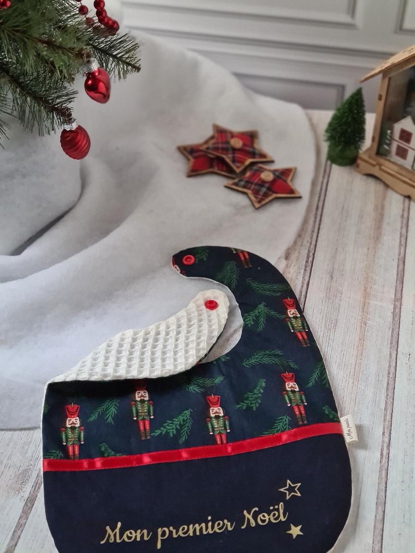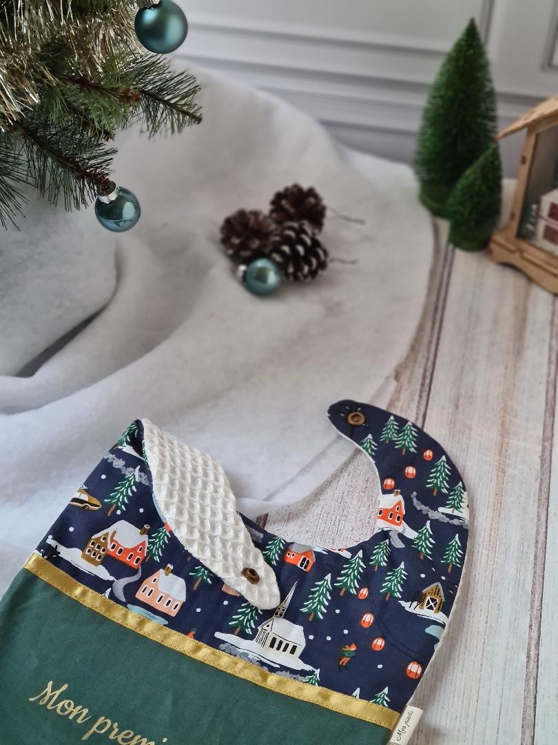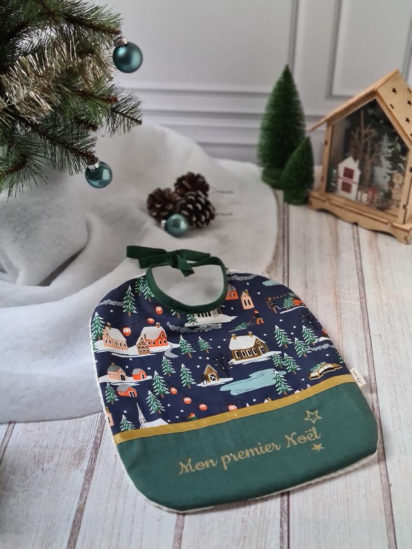 Ce bavoir se ferme par une pression en résine ou un lien à nouer coordonné.e aux tissus du bavoir.