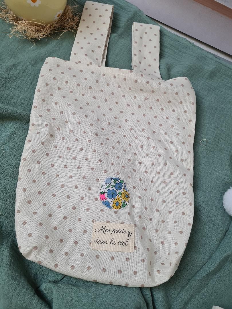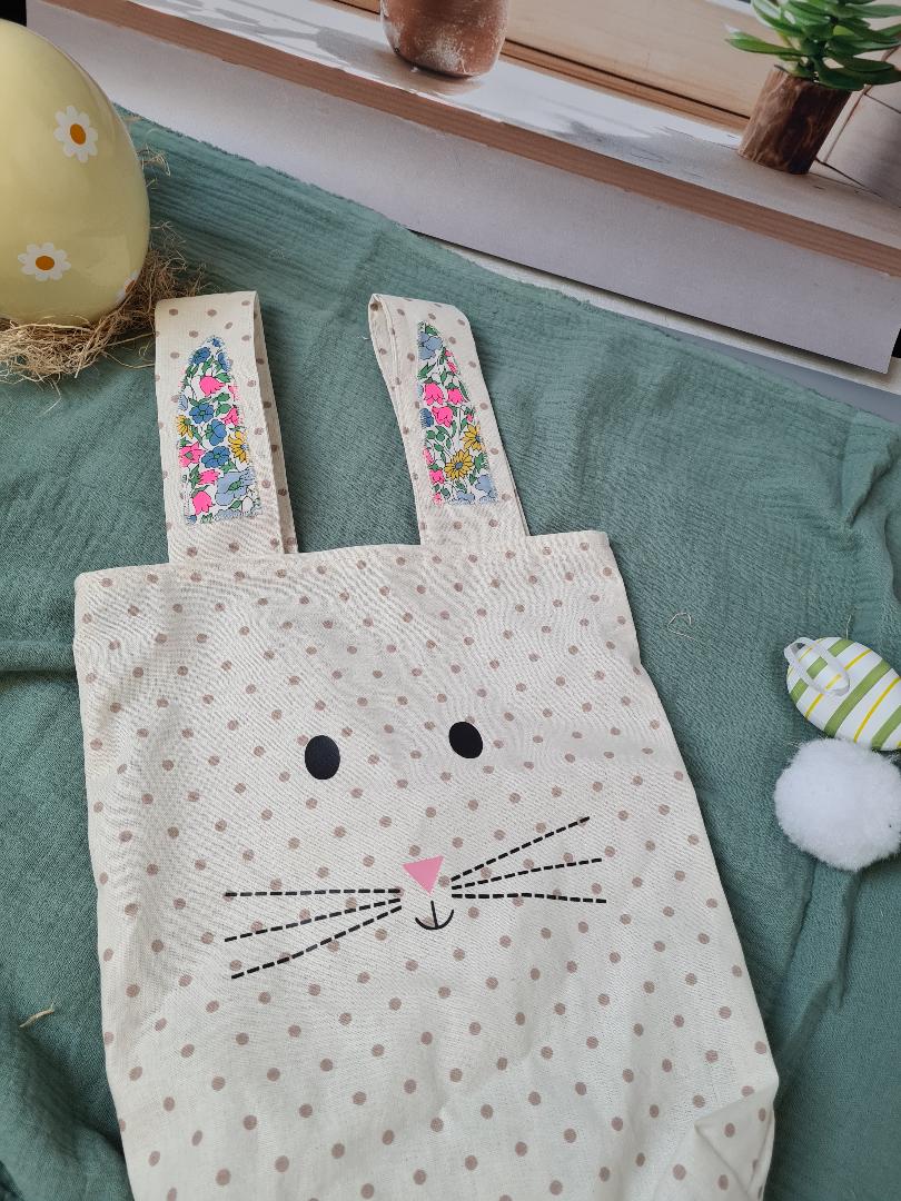 Les oreilles sur les anses et la fausse queue du lapin sont en Liberty ou autre tissu de votre choix